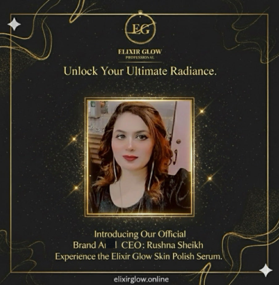 Miss Rushna Sheikh , the CEO of this skincare brand. Our mission is to illuminate your natural beauty with gentle yet powerful skincare solutions. We believe in enhancing your glow and giving your skin the care it truly deserves. We hope you love Elixir Glow as much as we do